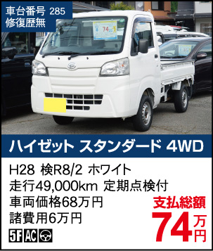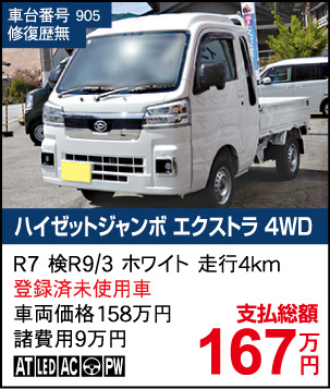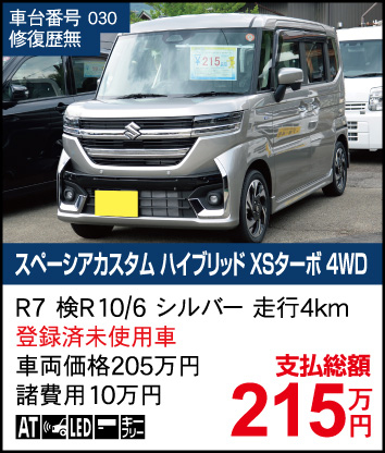 まず、登録済未使用車では、スズキ「スペーシア カスタム ハイブリッドXSターボ4WD」やダイハツ「ハイゼットジャンボ エクストラ 4WD」などの特別なクルマを取り揃えています。
