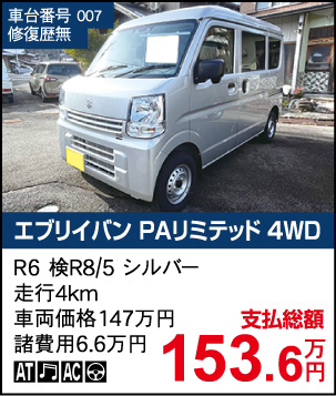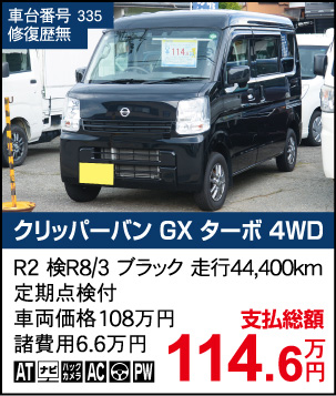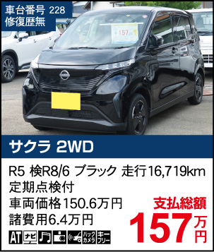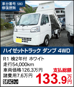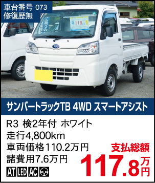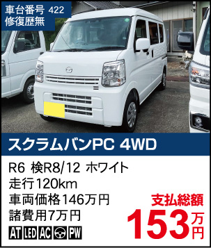 また、当社が厳選した「中古車」では、電気自動車のニッサン「サクラ 2WD」をはじめ、マツダ「スクラムバンPC 4WD」、スズキ「エブリイバンPAリミテッド 4WD」、ダイハツの「ハイゼットトラック ダンプ4WD」、「ハイゼット スタンダード4WD」、スバル「サンバートラックTB 4WDスマートアシスト」、ニッサン「クリッパーバンGXターボ4WD」など、良質な車両を取り揃えています。