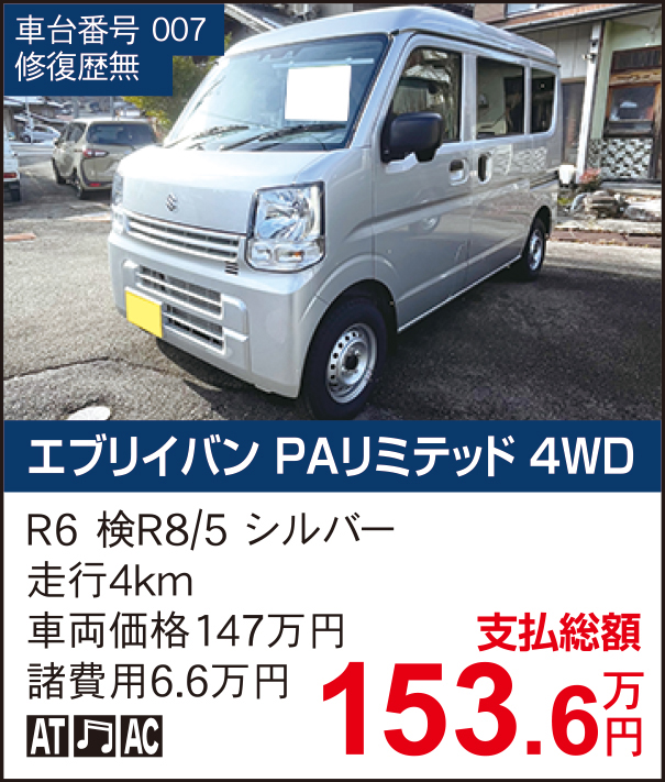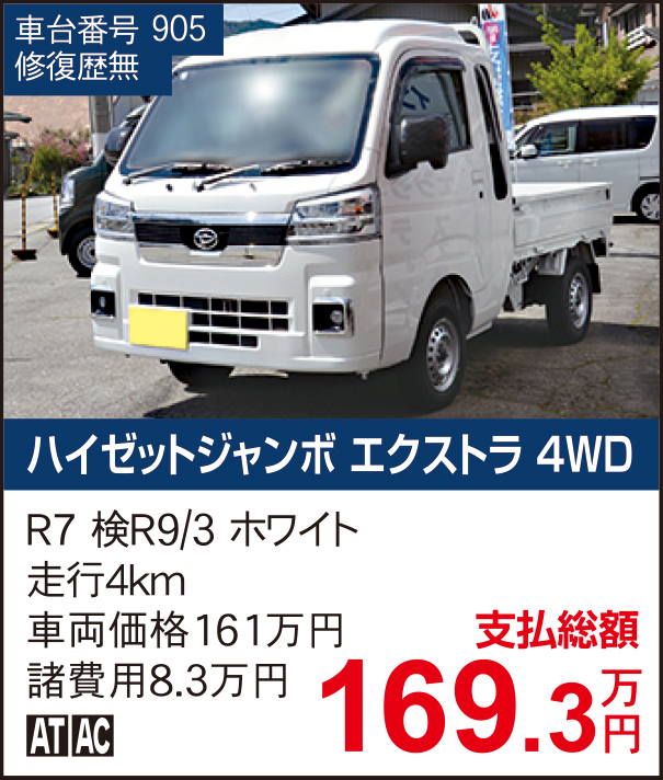 大宮自動車では、お値打ちな「登録済未使用車」や厳選した「中古車」なども販売しています。まず、登録済未使用車では、ダイハツ「ハイゼットジャンボ エクストラ 4WD」やスズキ「エブリイバンPAリミテッド 4WD」などの特別なお車を準備しています。