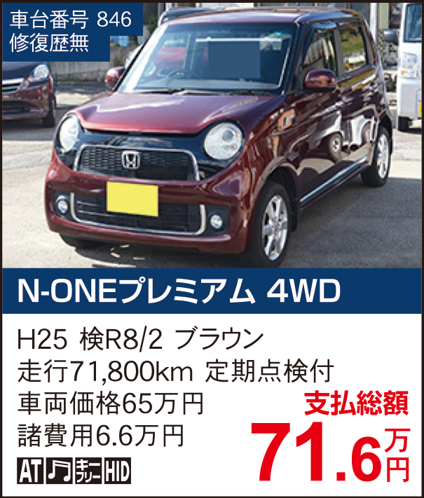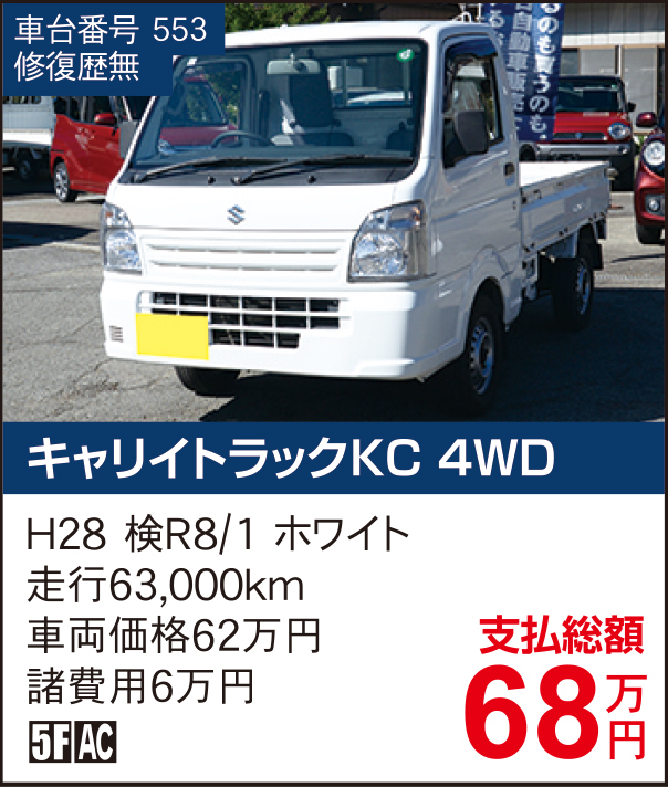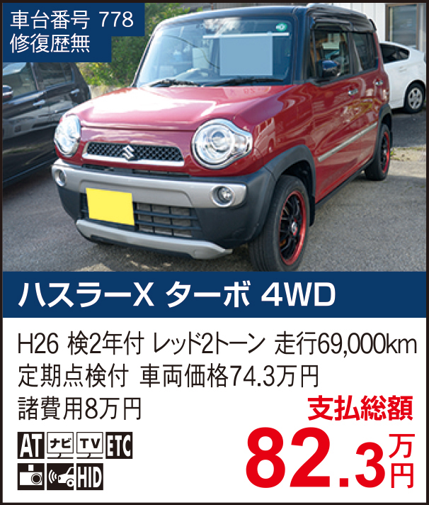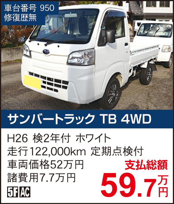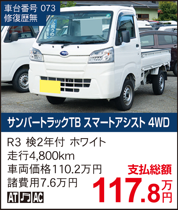 また、当社が厳選した「中古車」では、スバル「サンバートラックTBスマートアシスト4WD」や「サンバートラックTB・4WD」、ホンダ「N―ONEプレミアム4WD」、スズキ「ハスラーXターボ4WD」などの良質な中古車を取り揃えています。