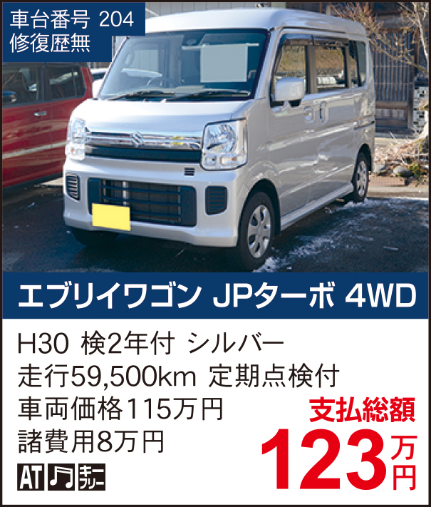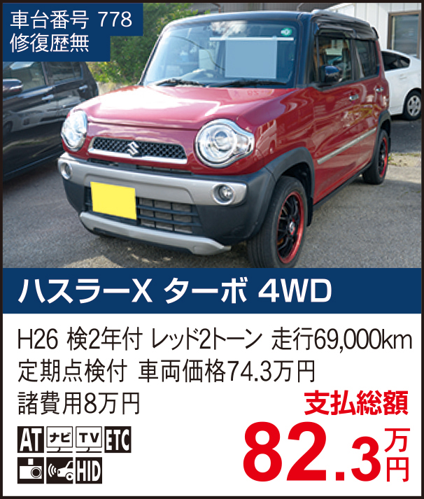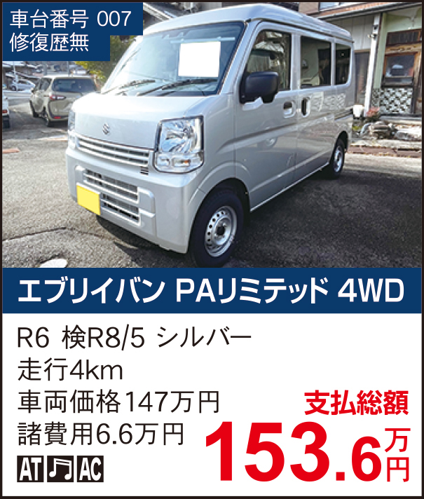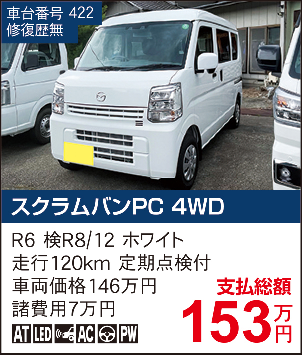 また、登録済未使用車では、スバル「サンバートラックTBスマートアシスト4WD」、ダイハツ「ハイゼット・エクストラ4WD」、マツダ「スクラムバンPC/4WD」、スズキ「エブリイバンPAリミテッド4WD」、など、お値打ちな軽自動車などを取り揃えています。